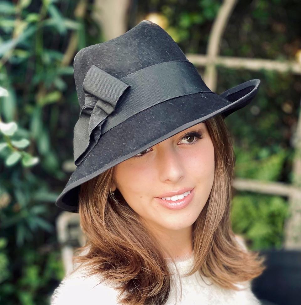 This jaunty black hat can be worn for casual and formal.occasions. Feminine black fedora with a unique shape. You can bend the brim up or down if you apply a little steam first. I made this one-of-a-kind hat in my millinery studio in the Hollywood Hills using the finest pure wool felt. It took me 3 days to steam, block, shape, size and trim. A similar one byPhilip Treacy costs several thousand dollars.