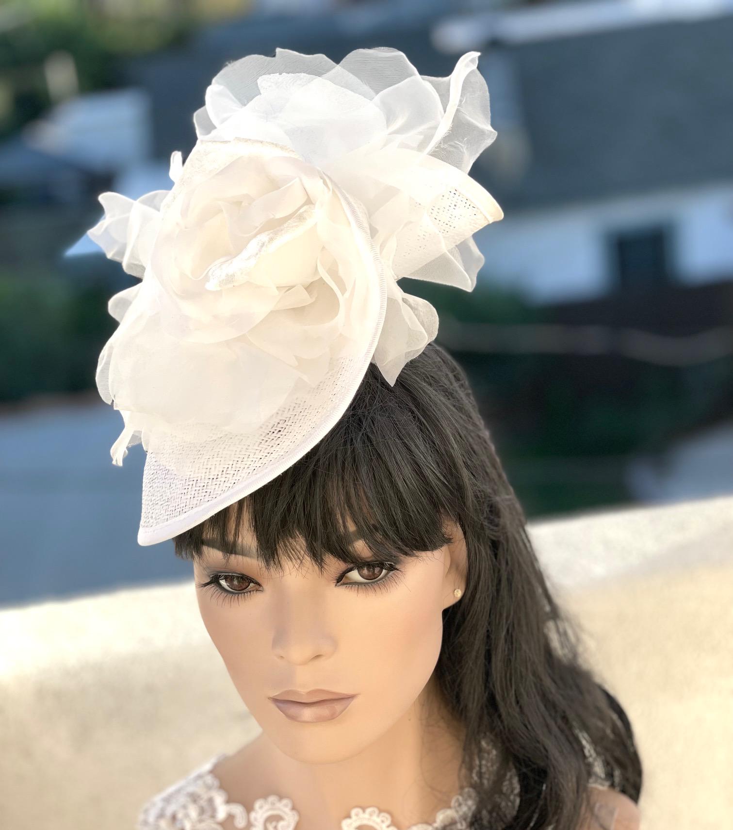This lovely white fascinator would be perfect for a bride, the horse races, a garden party or tea party. The beautiful oversized organza flower is a stunning. This is a hat that will turn heads.