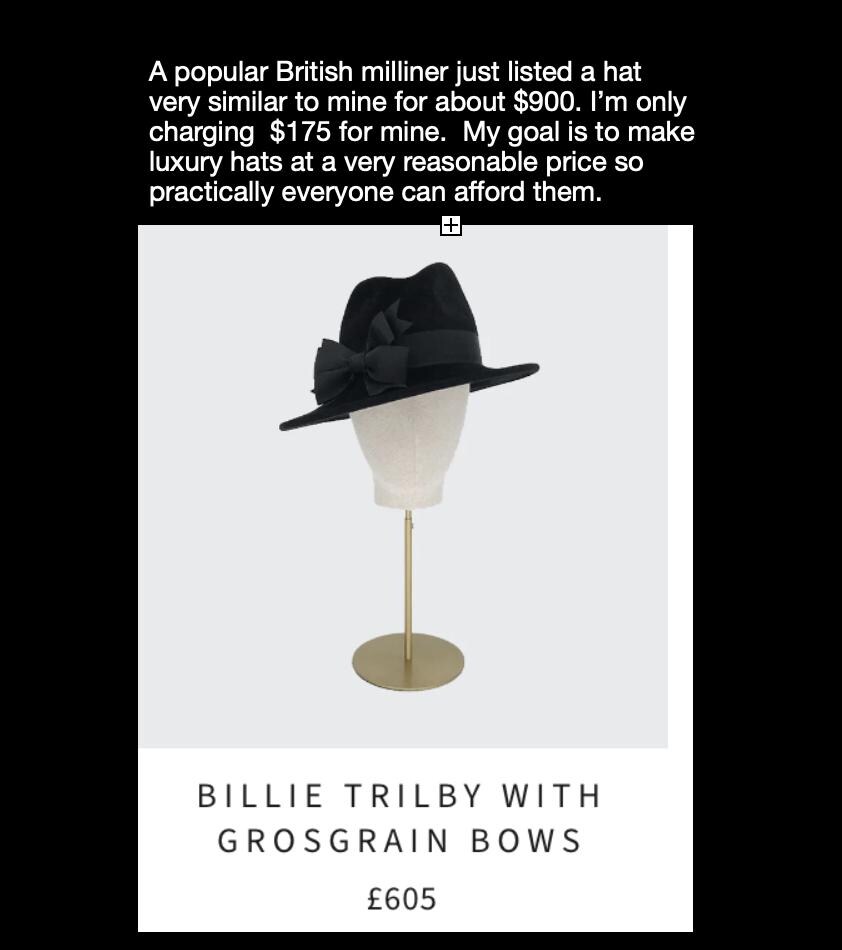 My hats have been featured in British Vogue, Brides and Victoria Magazine and been worn at all three royal weddings, Kentucky Derby, Ascot and been commissioned by Disney and other studios.