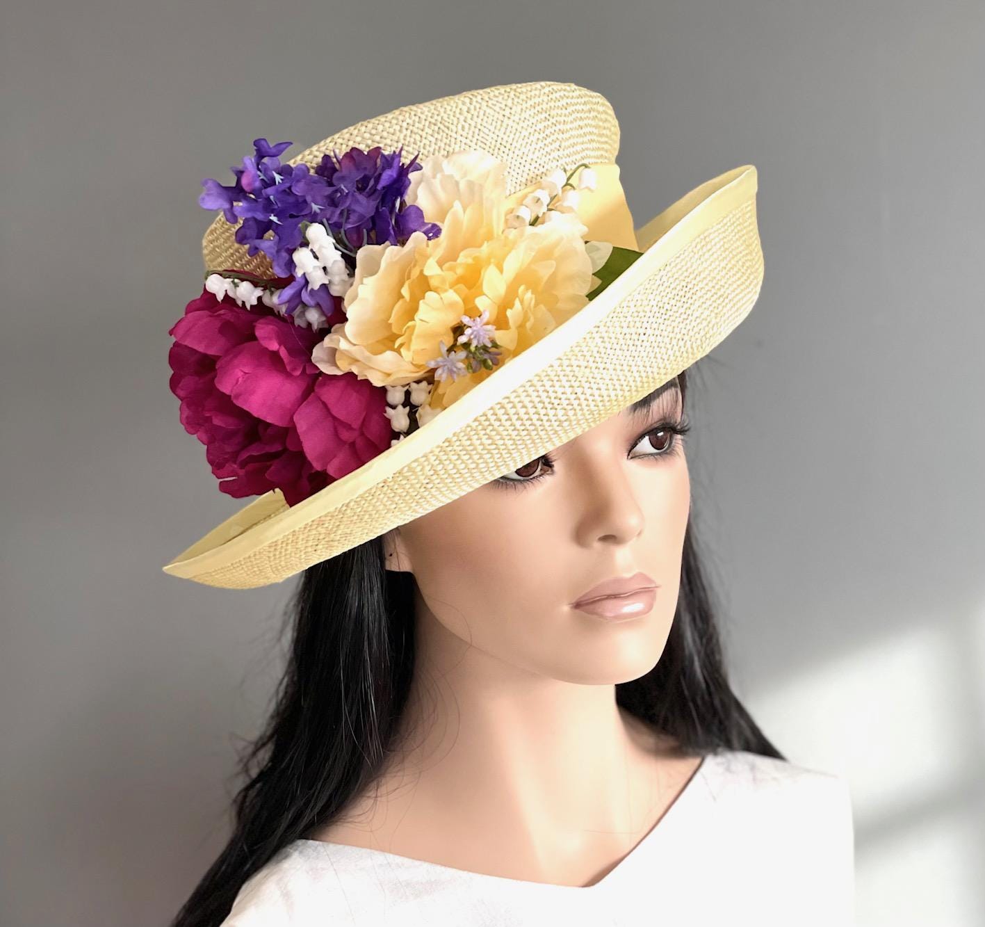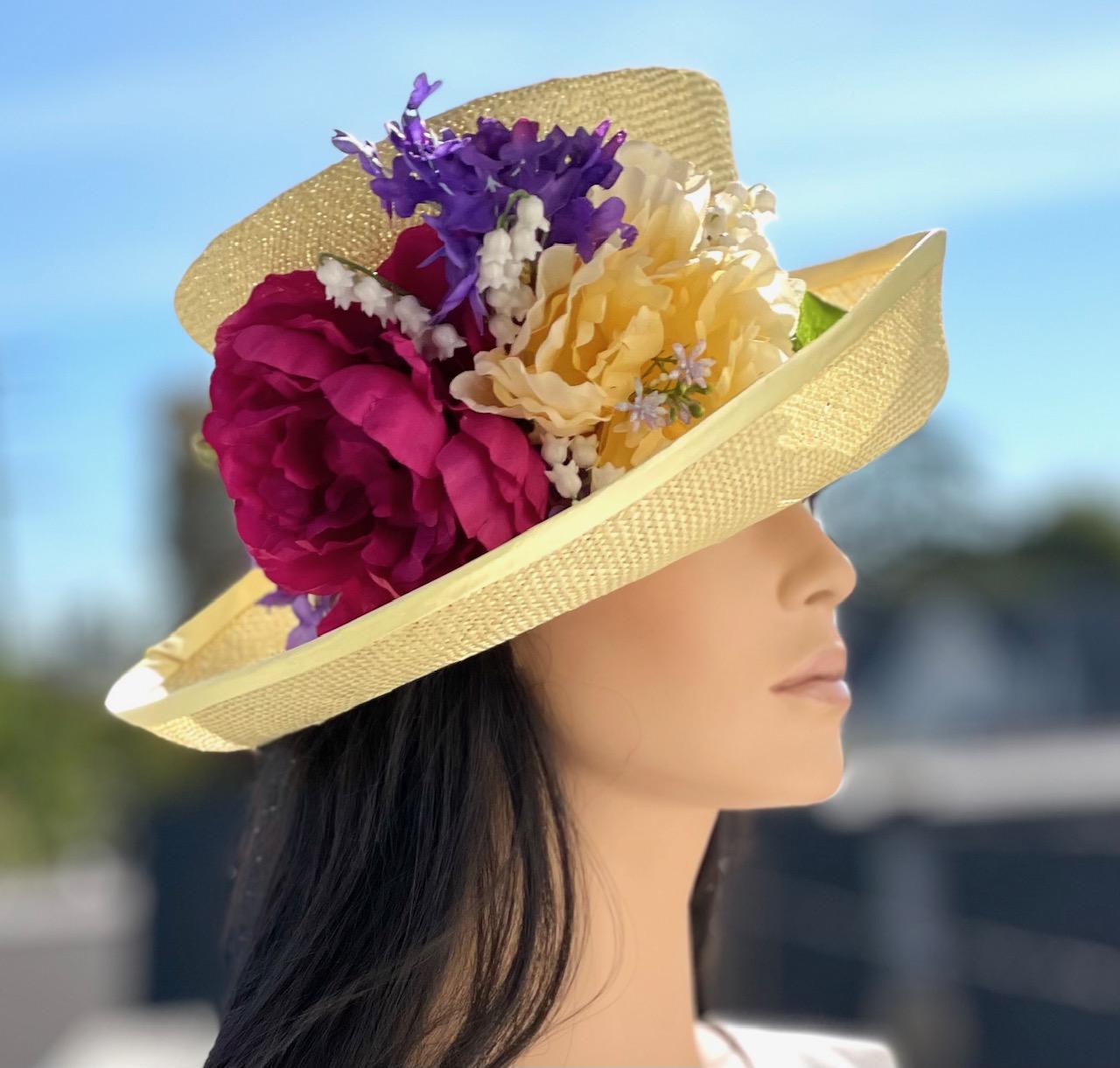 I made this cheerful summer hat in my millinery studio in the Hollywood Hills. I dyed the natural sisal straw a soft lemon yellow and trimmed it with a bouquet of flowers to coordinate with any color outfit. It took a master weaver 5-7 days to weave this one piece of straw by hand and it took me 3 days to dye, dry, steam, shape, size and trim. This hat is sure to brighten your day. One-of-a-kind.