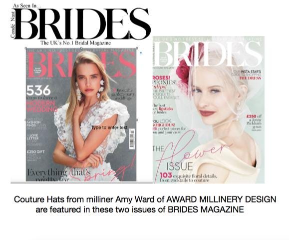 My hats have been featured in British Vogue, Brides, Victoria and Weddings magazines. They've been worn at the Royal Weddings, Royal Ascot, Buckingham Palace garden parties, Kentucky Derby and Melbourne Cup.