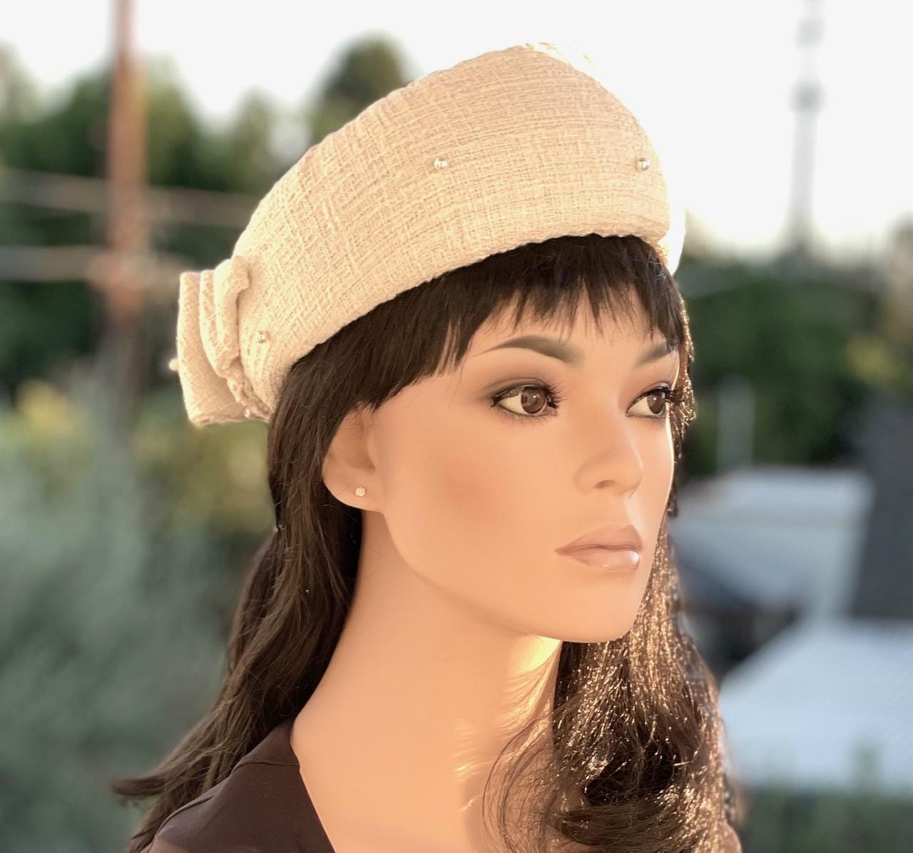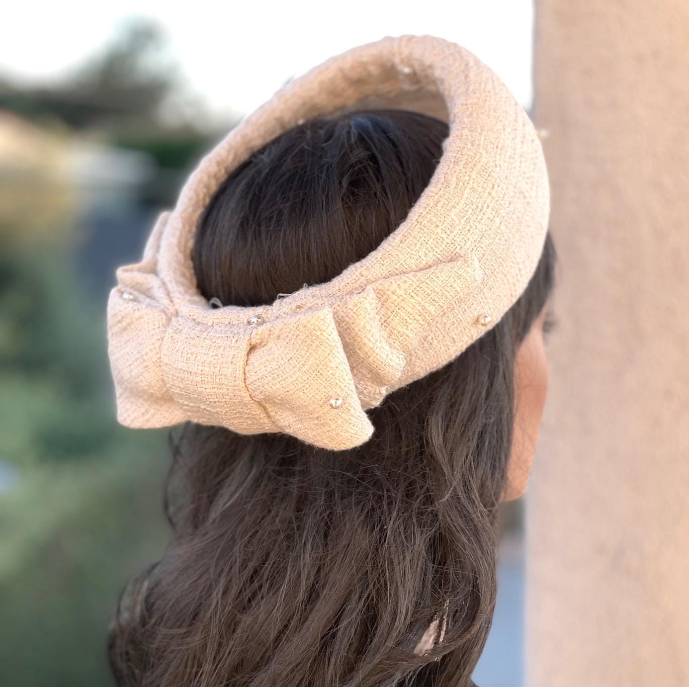 This ivory open back headband hat with bow in the back is a Chanel like weave that's encrusted with pearls. If you visit Jane Taylor Millinery you'll see that London milliner charges over $1727 for a hat similar to this (see photo I included). The style is retro elegance with a modern twist and Princess Kate is often photographed wearing this style.