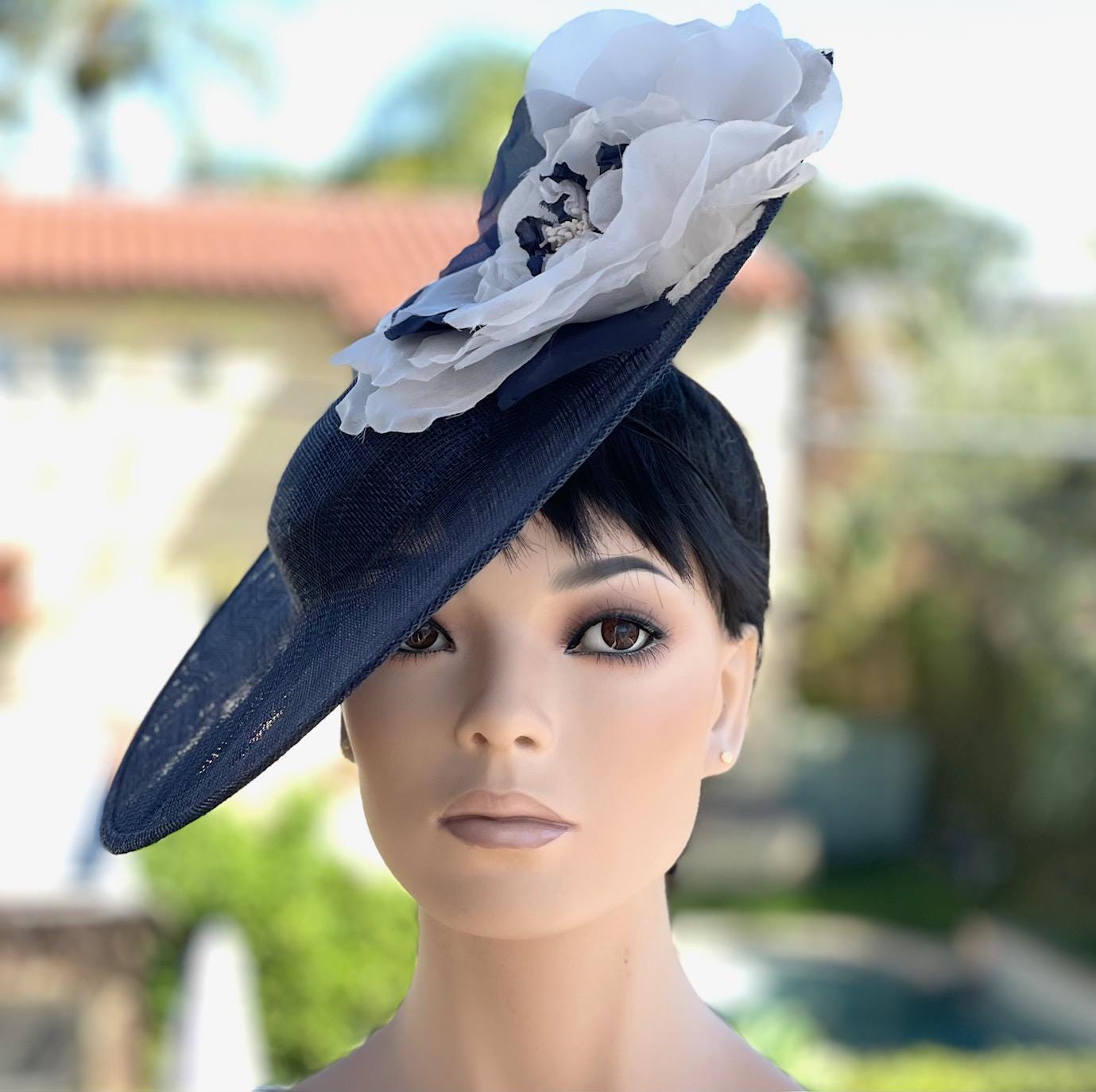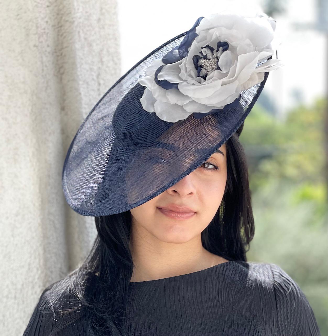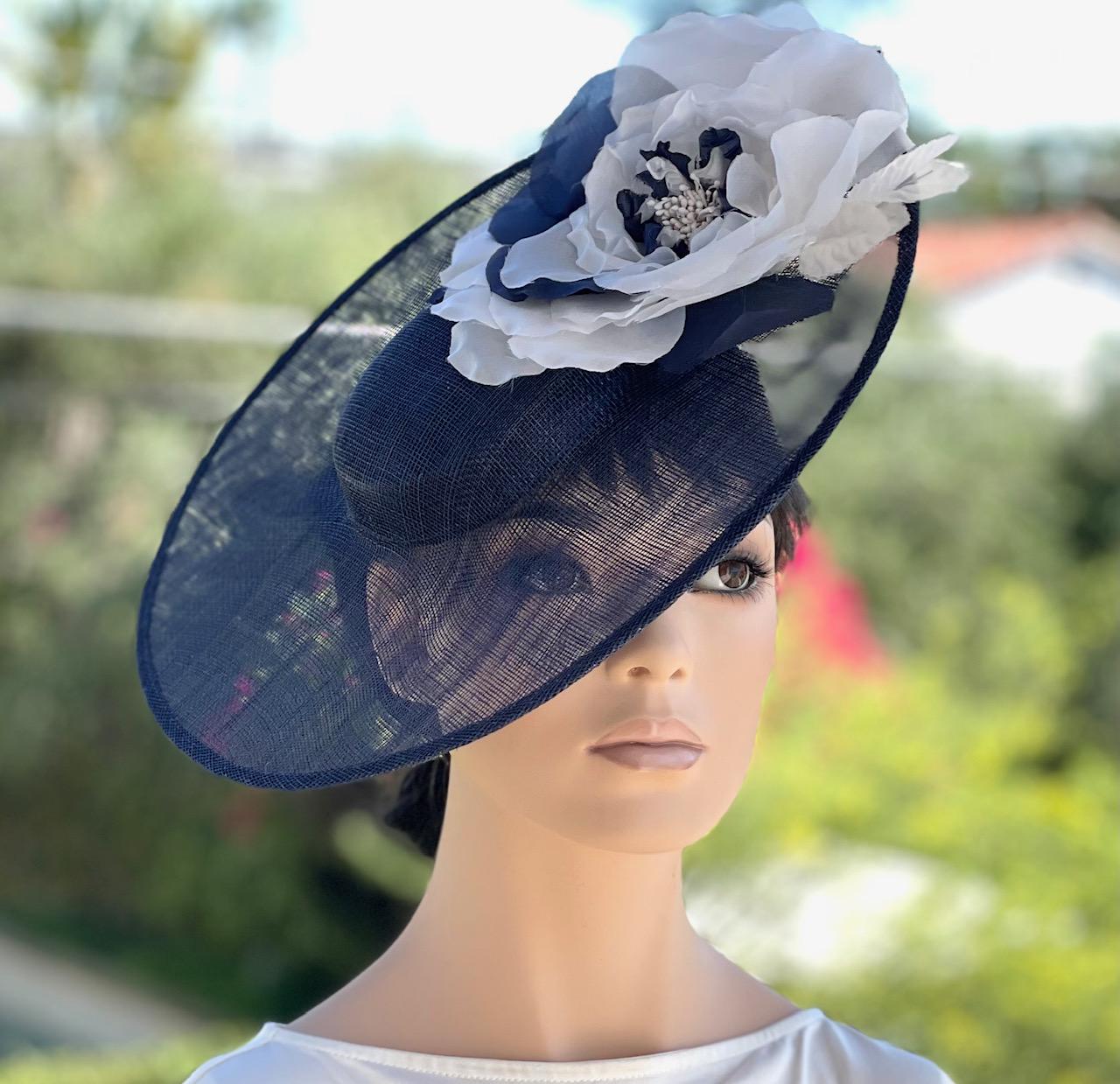 I trimmed it with a huge navy and white pure silk handmade flower and finished it off with a curled quill. This style is a favorite with Princess Kate. (see photos of her wearing them here). Except the UK milliners she got hers from charge $3000 - $4000. Perfect for the Kentucky Derby, Royal Ascot, a wedding or any special event. One-of-a-kind.