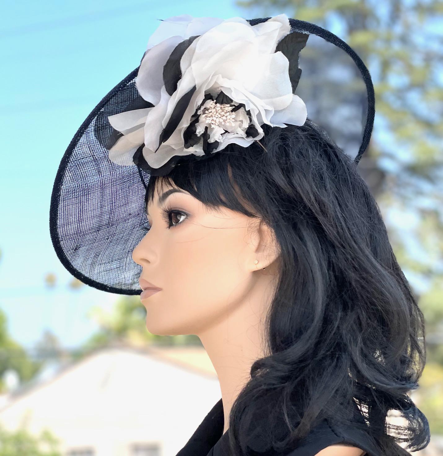I trimmed it with a huge navy and white pure silk handmade flower and finished it off with a curled quill. This style is a favorite with Princess Kate. (see photos of her wearing them here). Except the UK milliners she got hers from charge $3000 - $4000. Perfect for the Kentucky Derby, Royal Ascot, a wedding or any special event. One-of-a-kind.