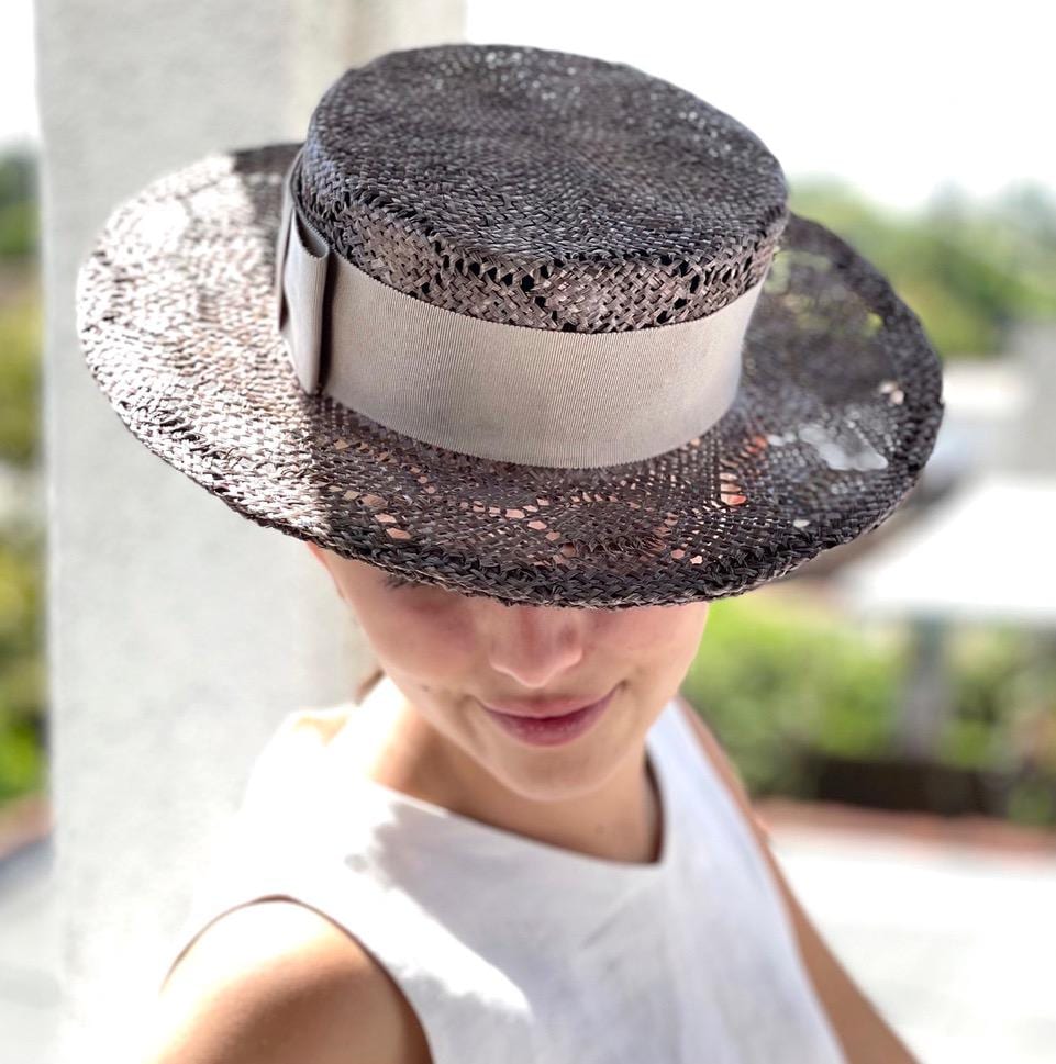 This striking brown straw boater hat is one of a kind. I made it in my millinery studio in the Hollywood Hills using a honeycomb weave and dyed it a chocolate coco color. It took me 3 days to dye. dry, steam, block, shape, size and trim. One-of-a-kind. A beautiful hat for the derby, a wedding or any special event. This style is a favorite with Princess Kate but UK milliners charge up to $3000 for this style. Hats are not returnable.