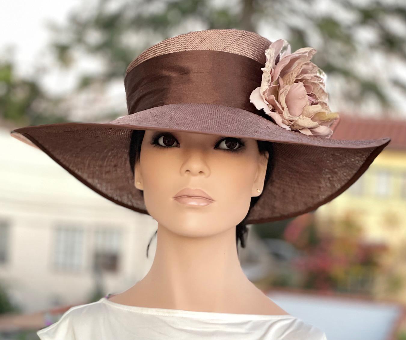 This classy chocolate brown wide brim hat is perfect for the derby, a wedding, polo or a graduation. It's a wonderful neutral that goes with almost everything. And dark brown is the 'it' color this season. One-of-a-kind.