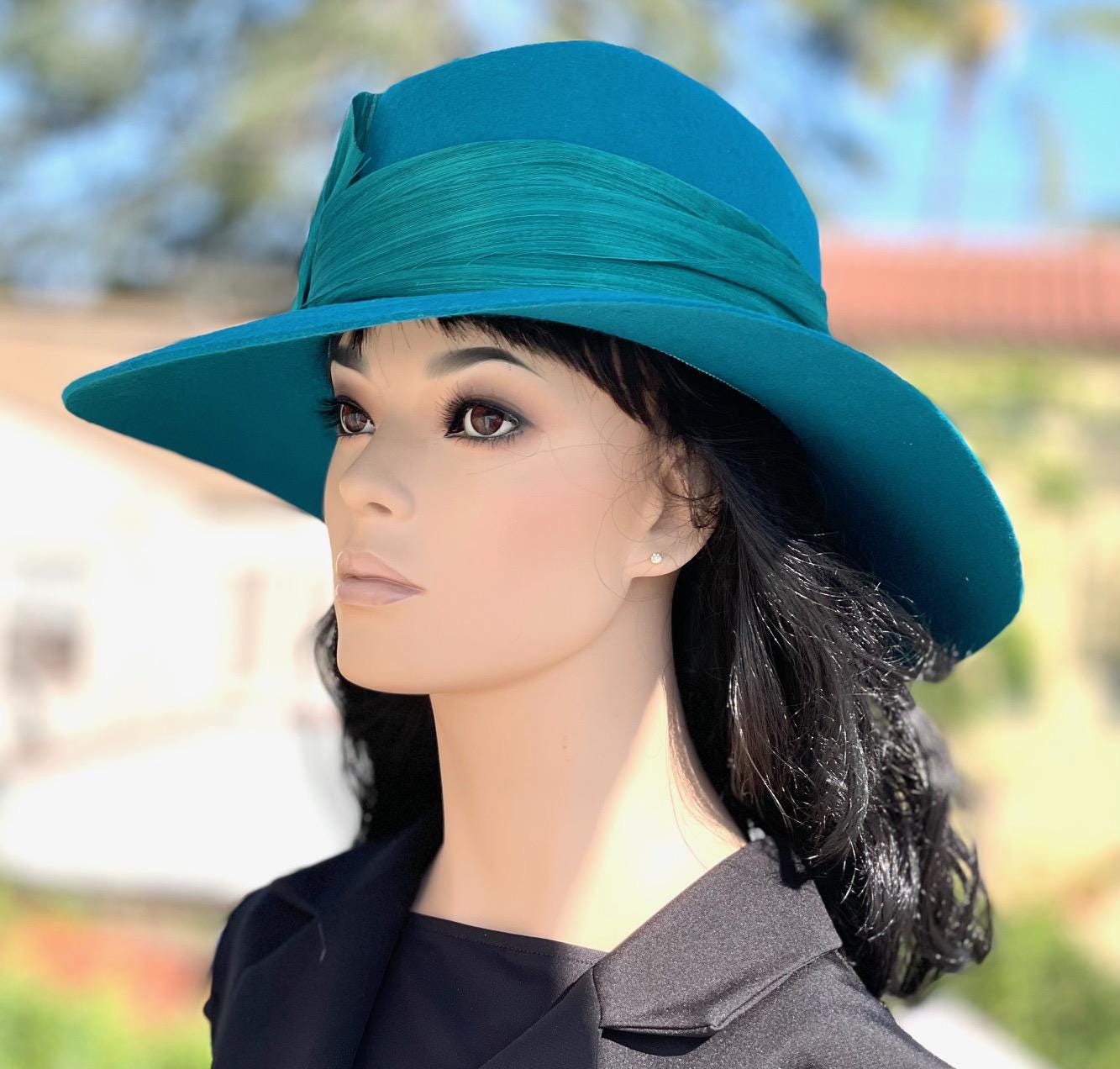 I hand made this striking turquoise fedora wide brim hat using 100% pure wool felt.