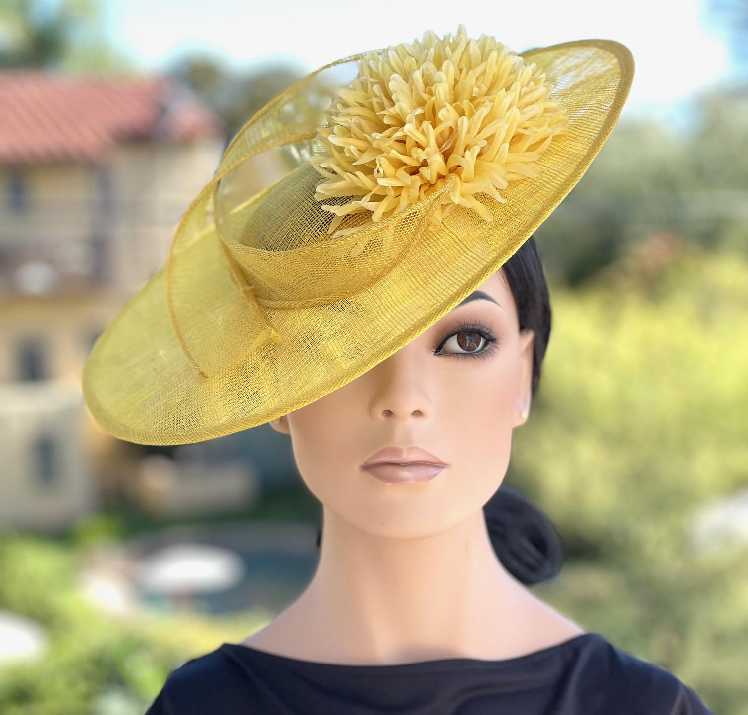 This yellow saucer hat is such a happy color and very popular this season. Princess Kate loves this style and British milliners charge $1000-$2000 for disc hats.