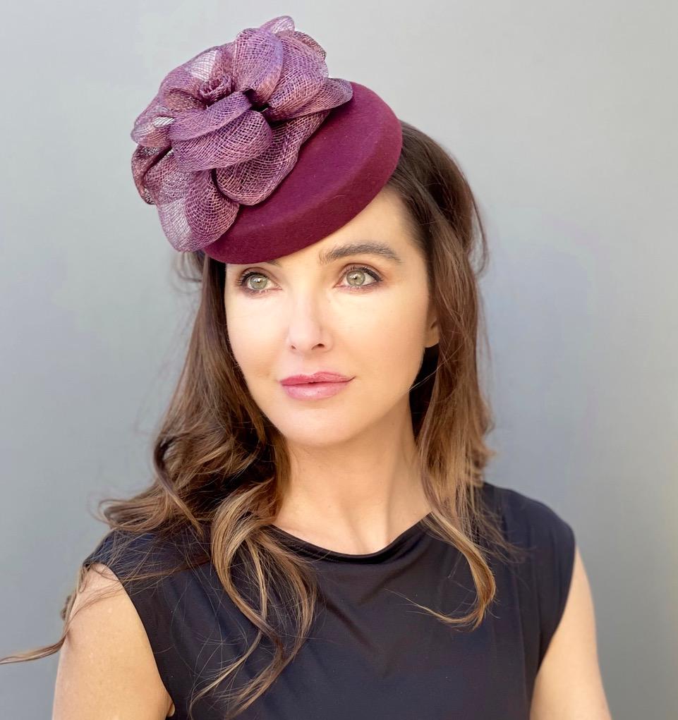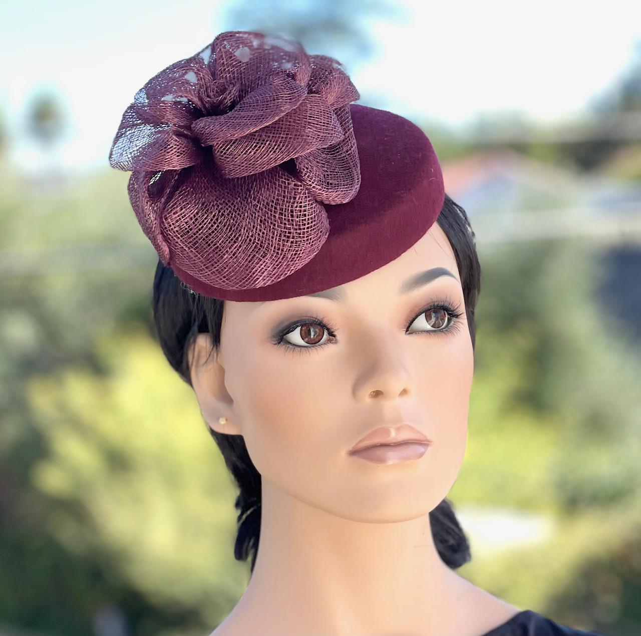 This burgundy wool felt hat with a large sinamay flower is trans seasonal. It would make a lovely wedding guest hat at a winter wedding. One-of-a-kind.