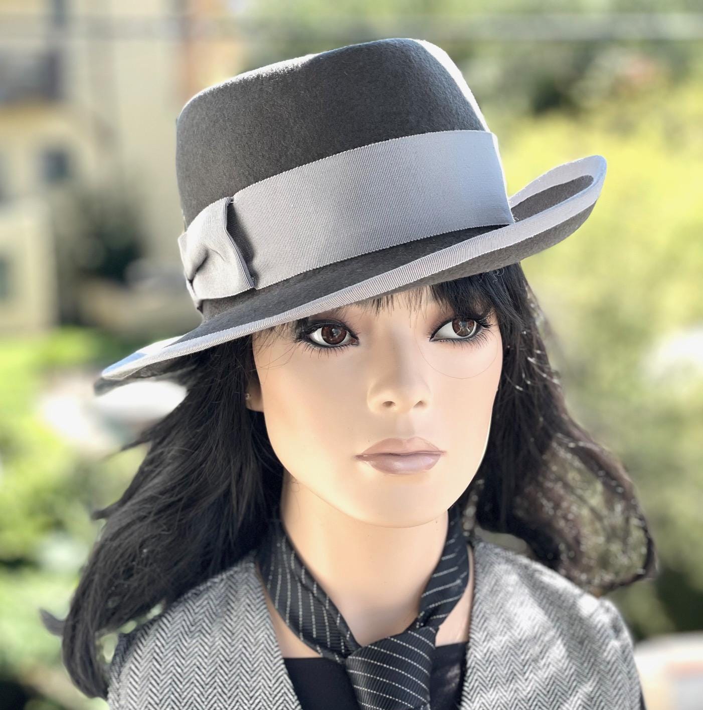 I made this charcoal and light gray fedora in my millinery studio in the Hollywood Hills, using the highest quality pure wool felt. It suggests a mid century retro vibe and is designed for women and men and it's comfortable to wear. It takes me 3 days to steam, block, shape, size and trim each hat. One-of-a-kind.