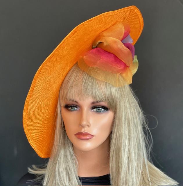 This fabulous saucer hat is as light as a feather with a slightly floppy waving motion. It is not stiff but has movement. Made in my studio in the Hollywood Hills. One-of-a-kind. I used the highest quality handwoven straw there is and dyed it this amazing shade of orange. It's a real statement piece with a rainbow of colors to blend with any color dress.