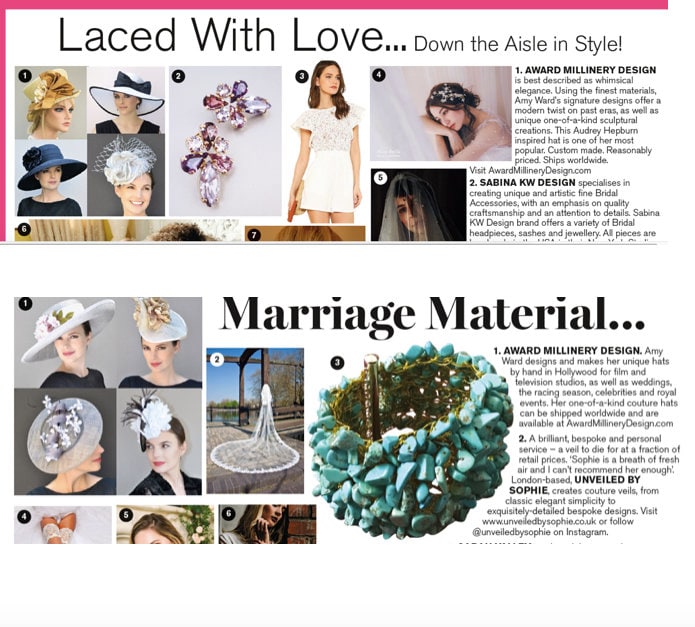 My hats have been featured in British Vogue, Brides Magazine, Victoria Magazine and been worn at the Royal Weddings, Royal Ascot, Buckingham Palace Garden Party, Kentucky Derby & Melbourne Cup. Recently Disney Studios commissioned me to make nine hats for them.