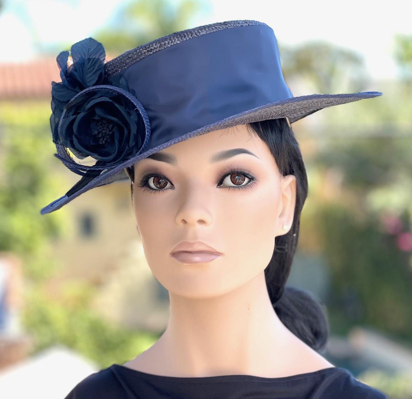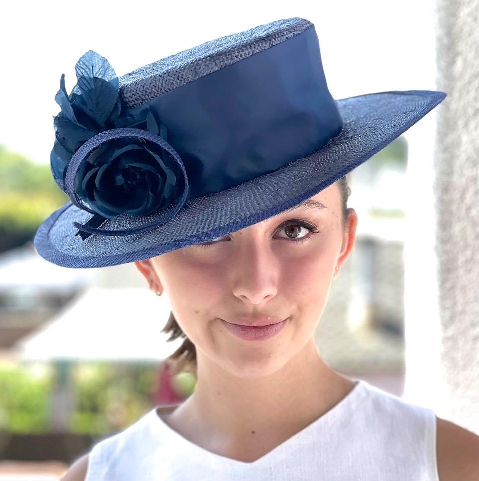 Boaters are the in hat this season, worn by Princess Kate and celebrities. I custom made boater hats for Jennifer Hudson and Ginnifer Goodwin this spring. Handmade in my millinery studio in the Hollywood Hills. It takes me 3 days to dye, dry, steam, block, shape, size and trim each hat. One-of-a-kind. I added dark blue handmade silk roses and a silky sash. Perfect for the races, polo, a wedding or garden party.