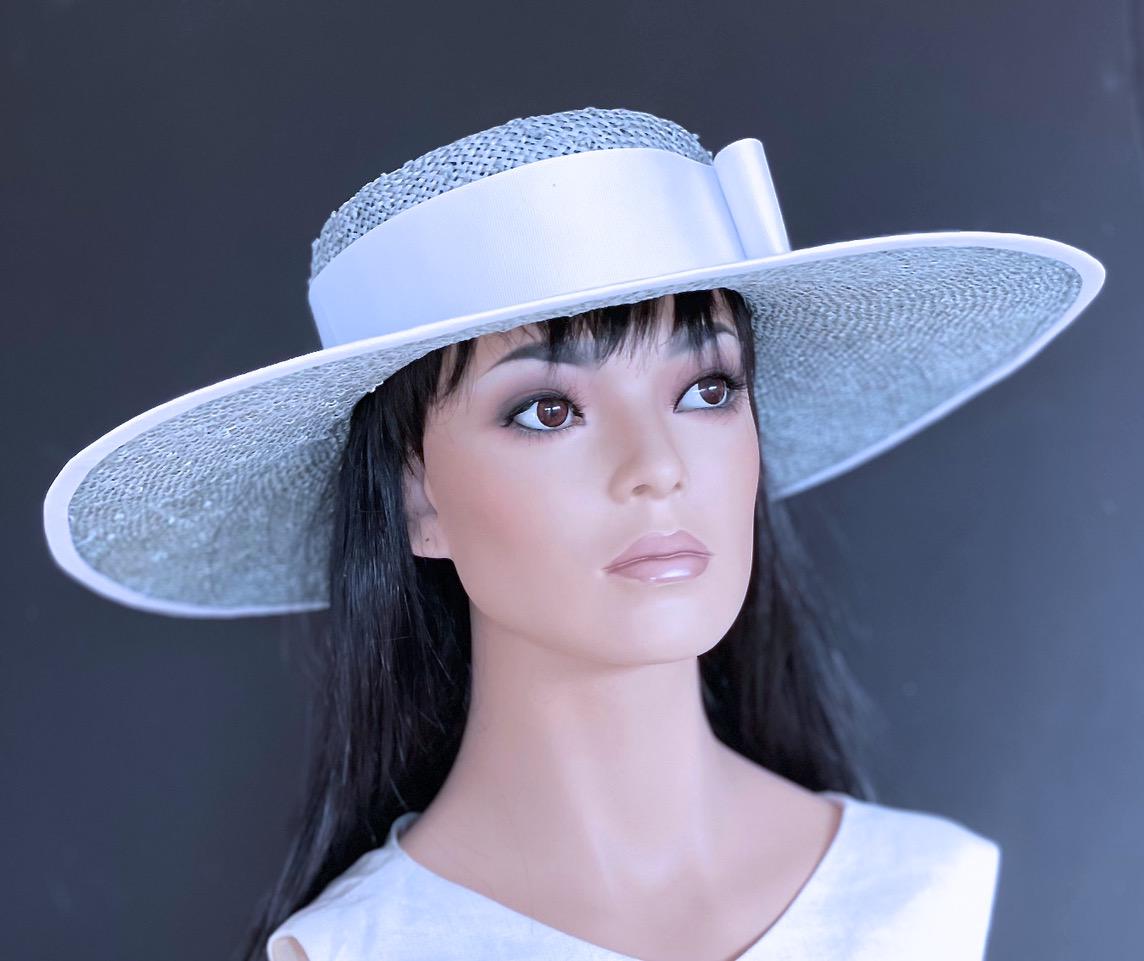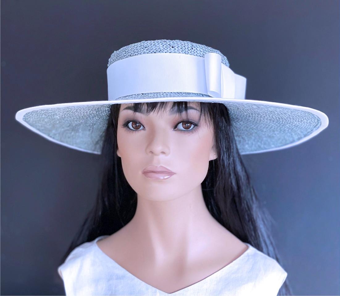 This wide brim hat was made in my millinery studio in the Hollywood Hills. Light blue is the in color this season. I dyed knotted sisal straw this lovely shade of light blue and trimmed it with crisp white grosgrain ribbon with a bow on the side. It takes me 3 days to dye, dry, steam, block, shape, size and trim each hat. One of a kind.
