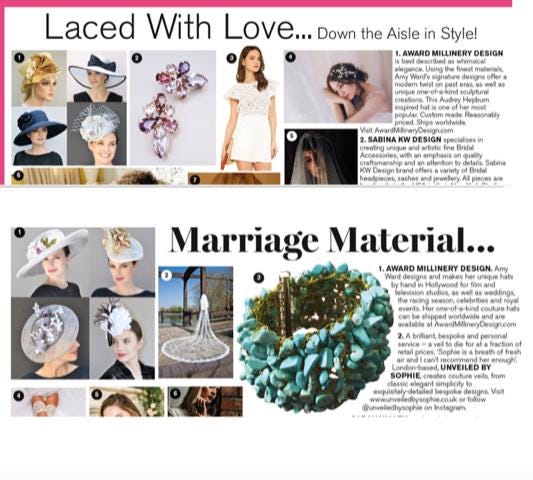 My hats are featured in British Vogue, Brides Magazine, Victoria and Best Weddings magazines and have been commissioned by Disney and other studios. They've been worn at the Royal Weddings, Ascot, Buckingham Palace garden parties, Kentucky Derby and Melbourne Cup.