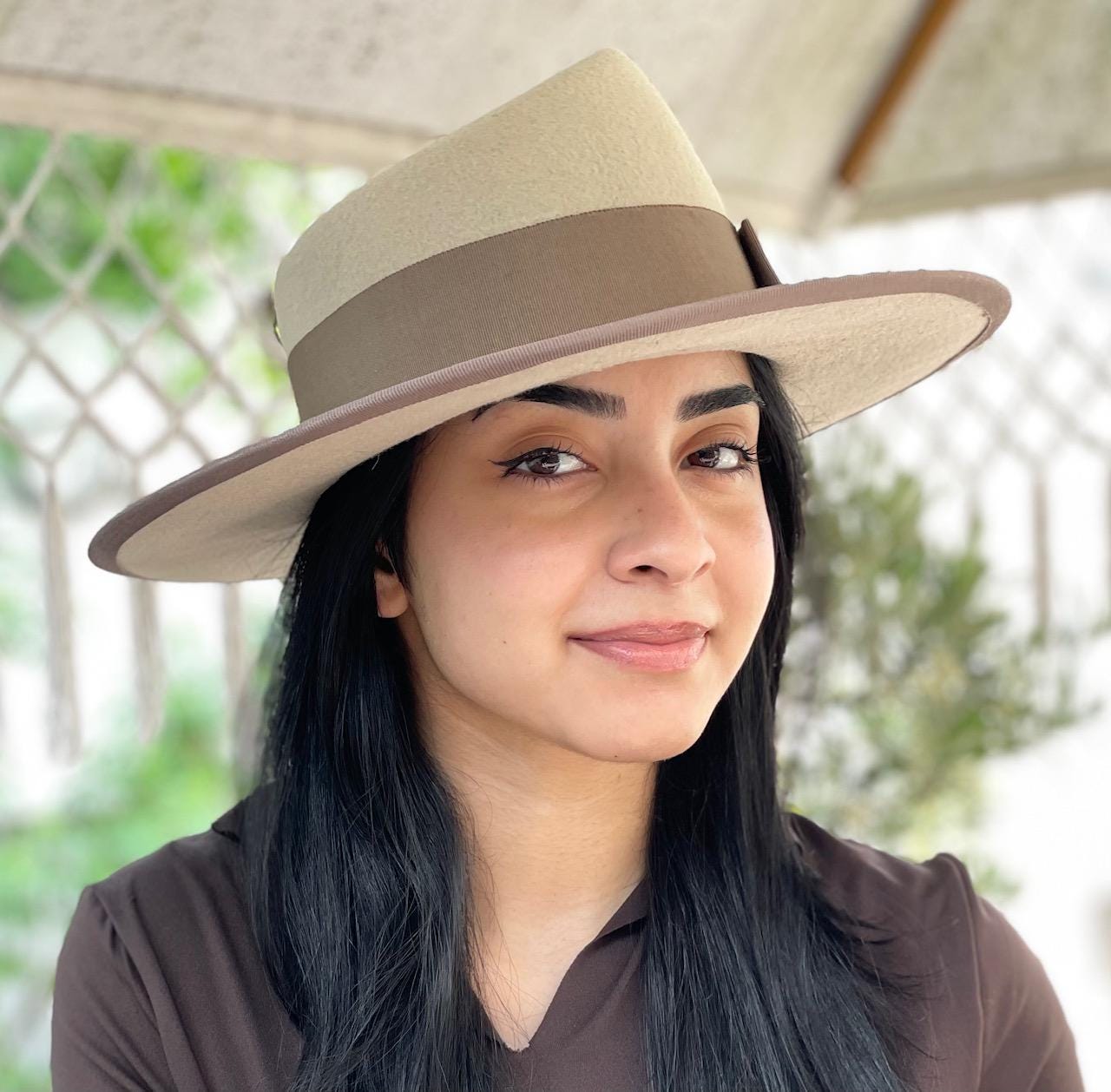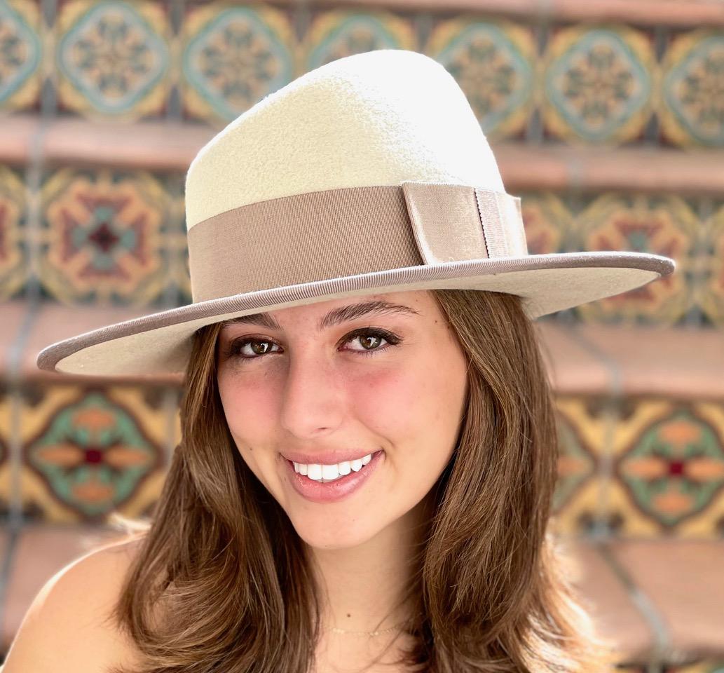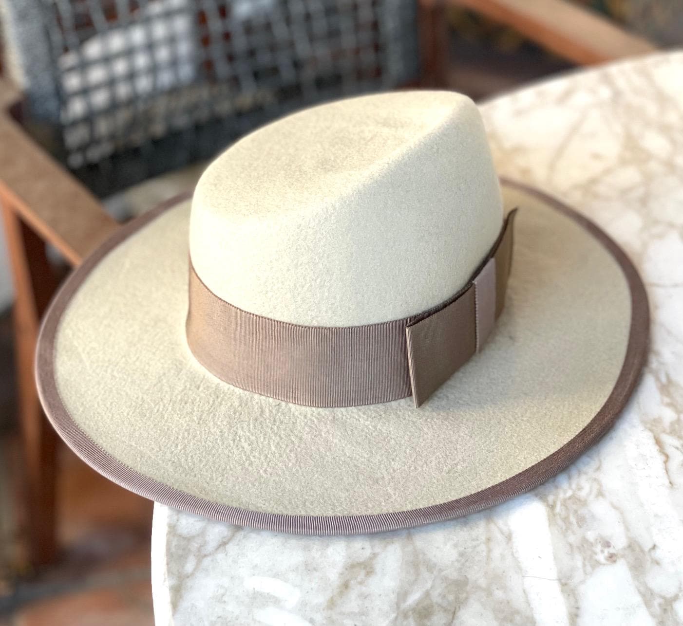 I made this one-of-a-kind wide brim fedora using a wonderful merino wool felt. It's a lovely shade of soft beige taupe which I trimmed with dark taupe grosgrain ribbon. This hat is the perfect neutral that you can wear with casual attire or a tailored coat, dress or suit. Perfect for the races, a wedding or any other special occasion. Made in my millinery studio in the Hollywood Hills. Philip Tracy sells his wide brim fedoras for $3000-$4000.