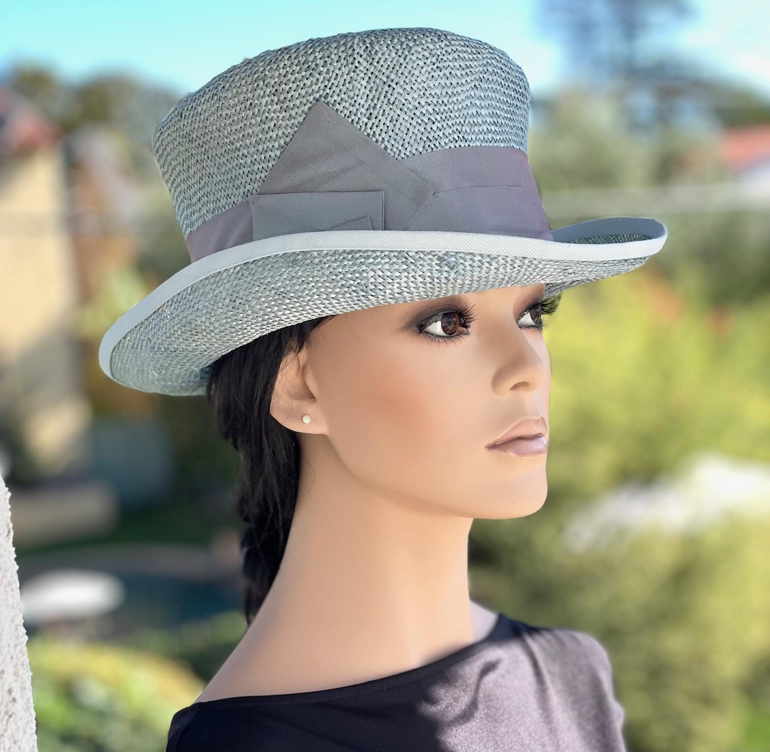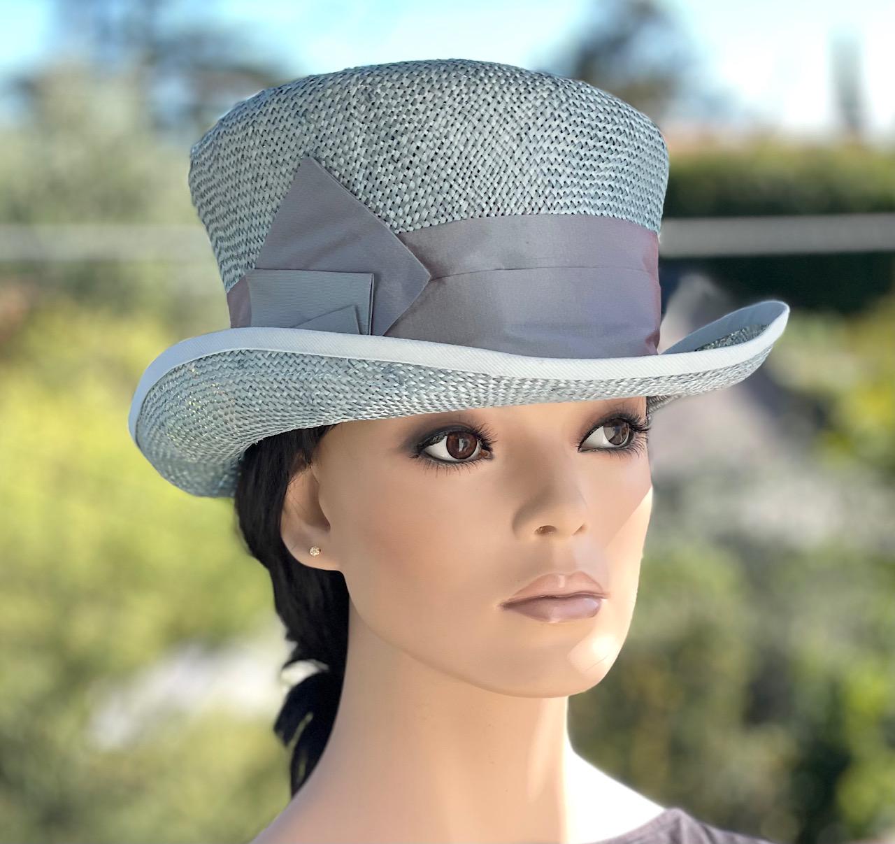Top British milliners set the newest style and colors for millinery and fashion. Pale blue, duck egg blue and robins egg blue are the most popular of the new pastels. I created this pale blue top hat which can be worn with tailored or formal attire. I've shown a photo of the edge of the brim where the straw is a little more open weave, although I doubt that anyone would notice without close inspection. I have reduced the price from $185 to $165 because of this.