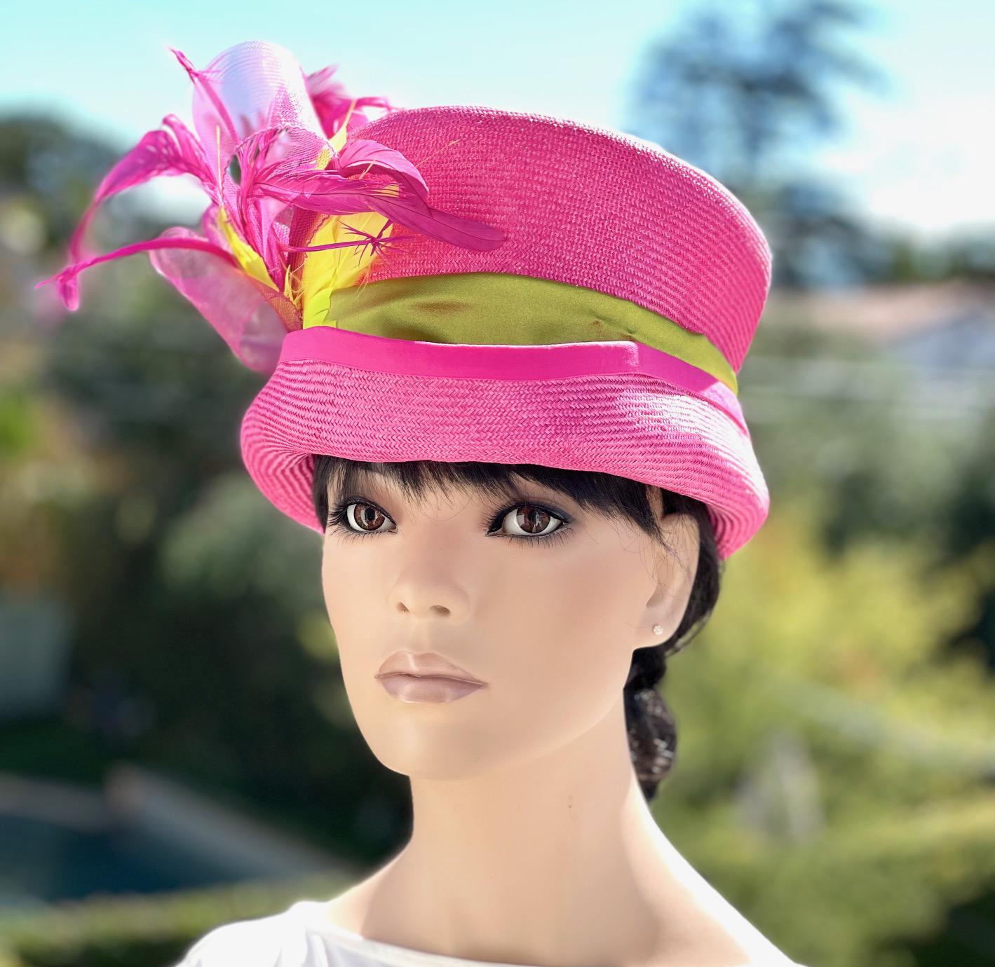 I made this striking pink, orange and lime green top hat hat that is unique and fashion forward. Perfect for the Kentucky Derby, Royal Ascot, Melbourne Cup and polo matches. It took a master weaver 7 days to weave this one piece of parasisal straw, the highest quality most expensive natural straw there is. Then it took me 3 days to dye, dry, steam, block, shape, size and trim. One-of-a-kind.