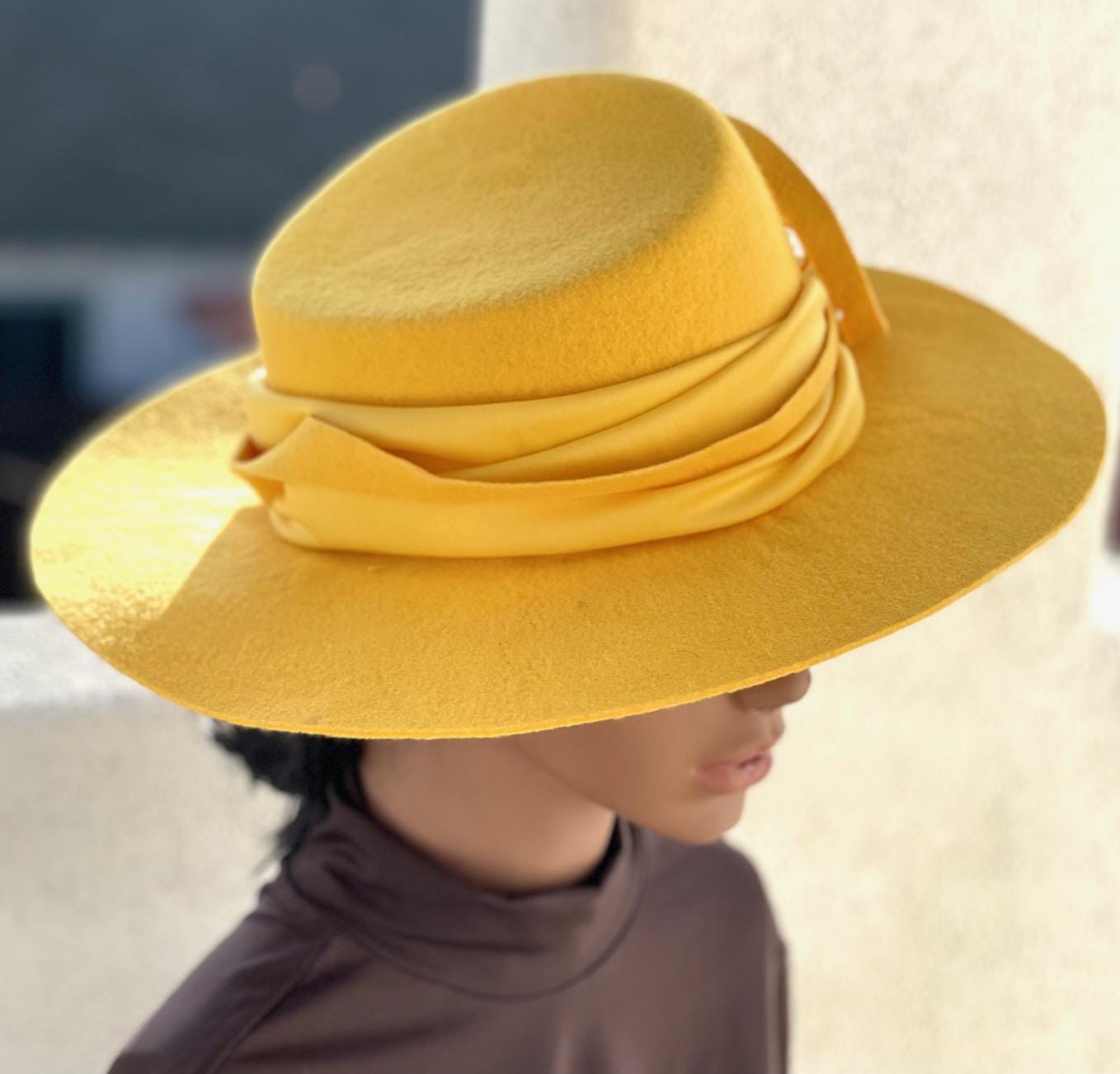 I made this beautiful canary yellow hat with 100% pure merino wool felt of the highest quality.