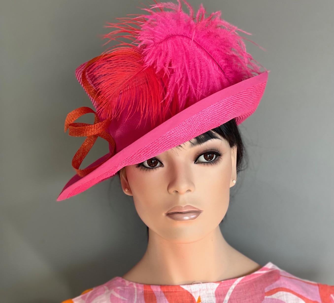 I made this stunning one-of-a-kind formal pink and orange hat with parasisol straw, the highest quality straw there is. The ostrich feathers and trim are orange and pink.