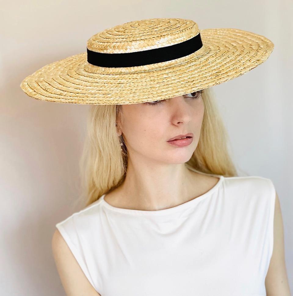 I made this charming boater hat in my millinery studio in the Hollywood Hills. Think summer in the south of France or a Venetian gondolier's hat.