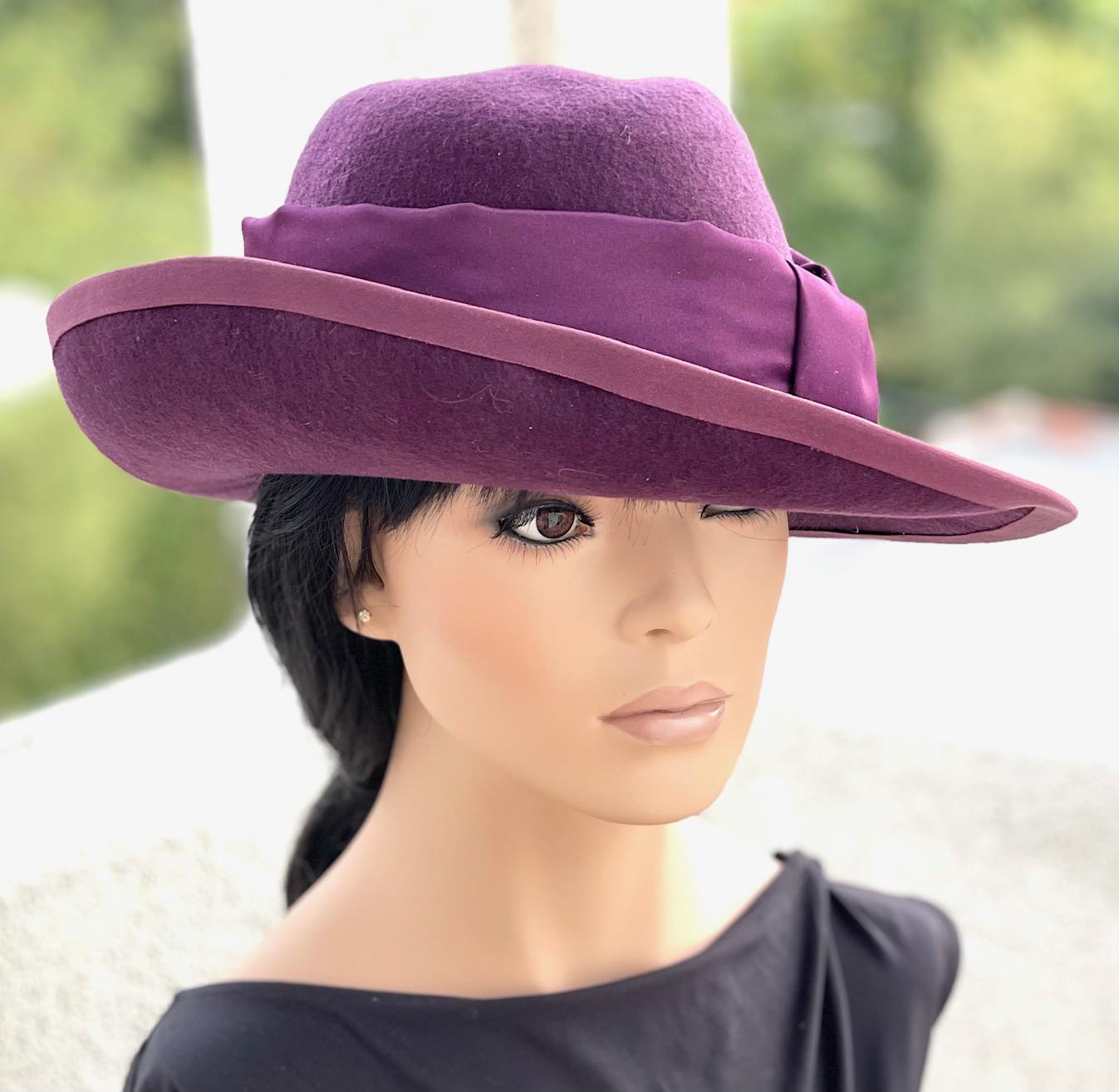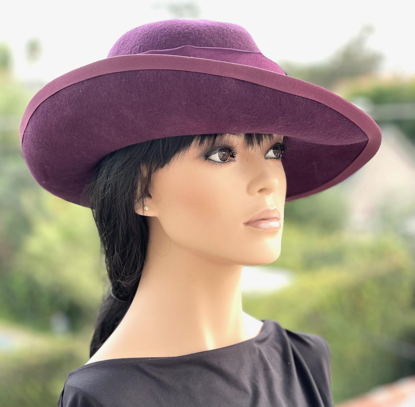 I made this hat by hand using a glorious shade of Bordeaux purple. I used pure 100% merino wool felt which molds to your head. It took me 3 days to steam, block, dry, shape, size and trim. It would be perfect for the races, polo, a wedding or any special occasion.