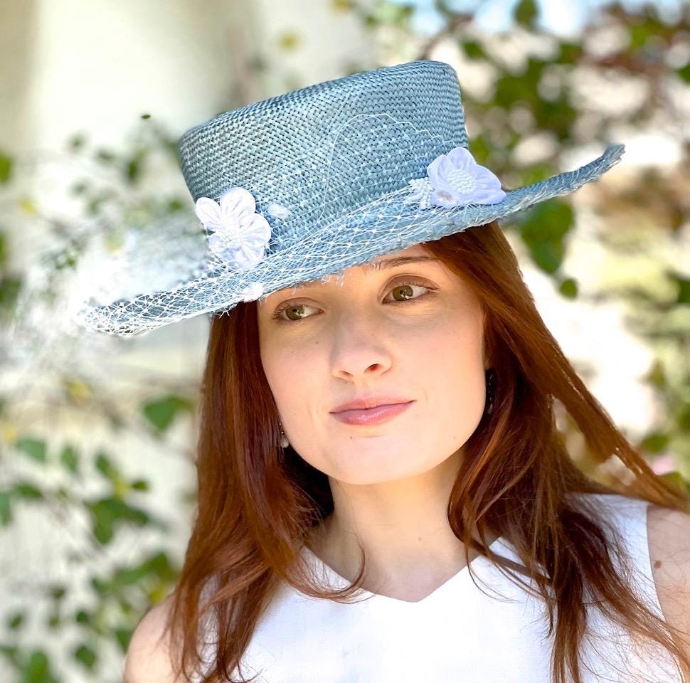 This feminine light blue straw boater hat is truly unique. I trimmed it with veiling and satin flowers with pearls in the center of each flower. One-of-a-kind. Boater hats are a favorite of Princess Kate.