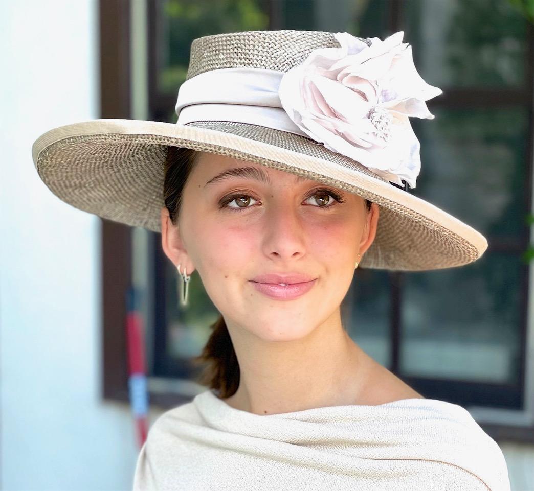 This romantic taupe and blush pink hat is so elegant. And taupe goes with everything. The delicate flower is handmade with pure silk.