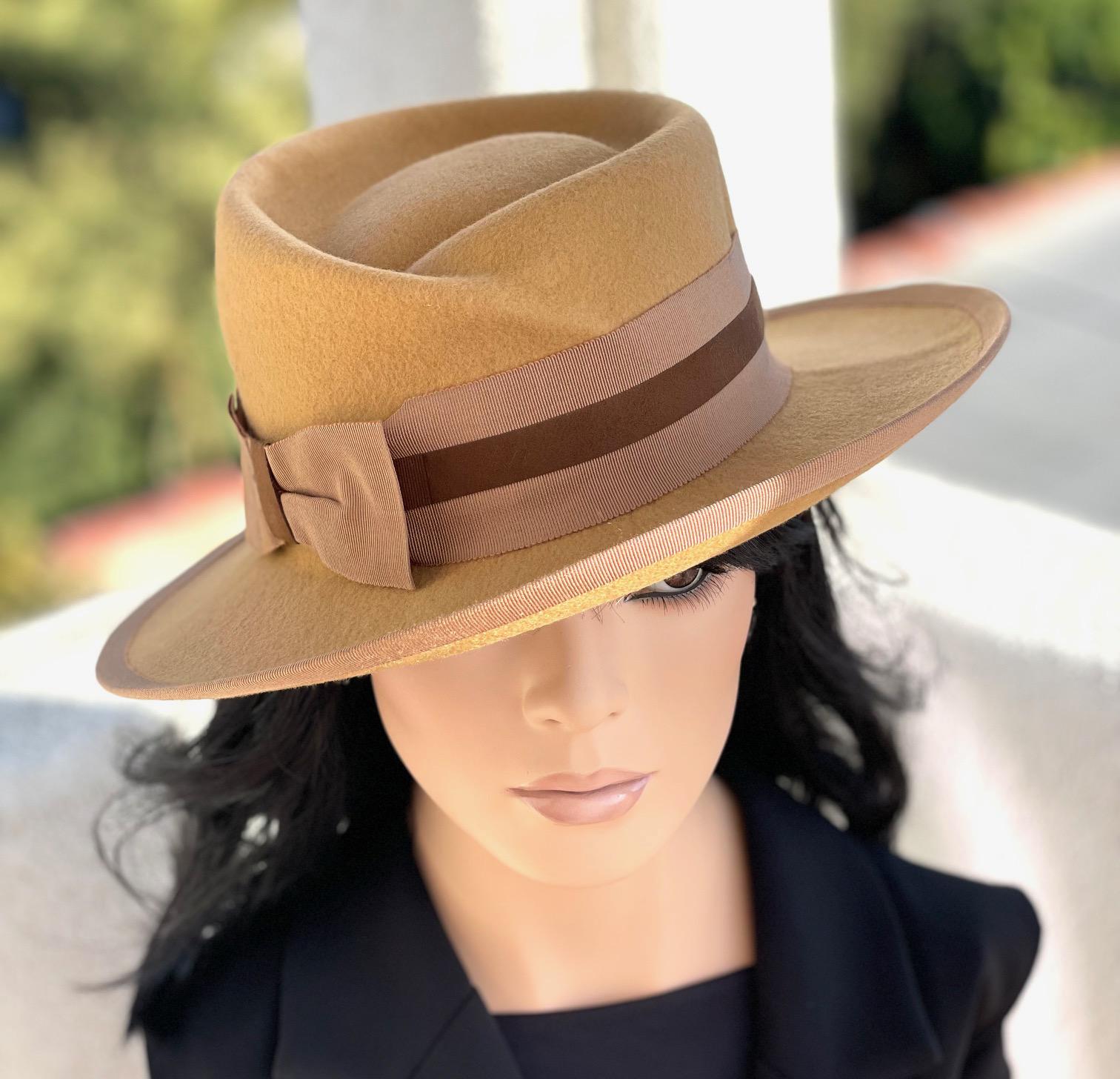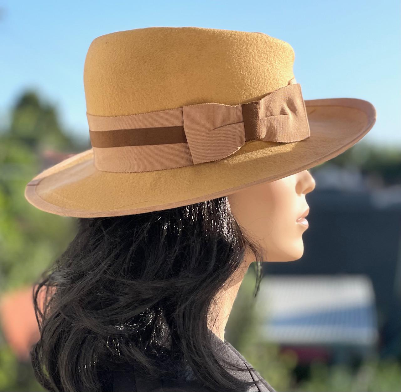 I made this rich mustard yellow wide brim hat by hand in my millinery studio in the Hollywood Hills using the highest quality 100% pure wool felt. It took me 3 days to steam, block. shape, size and trim. For the trim I used classic grosgrain ribbon and a dark brown faux swede. This charming hat is comfortable and keeps you warm in winter.