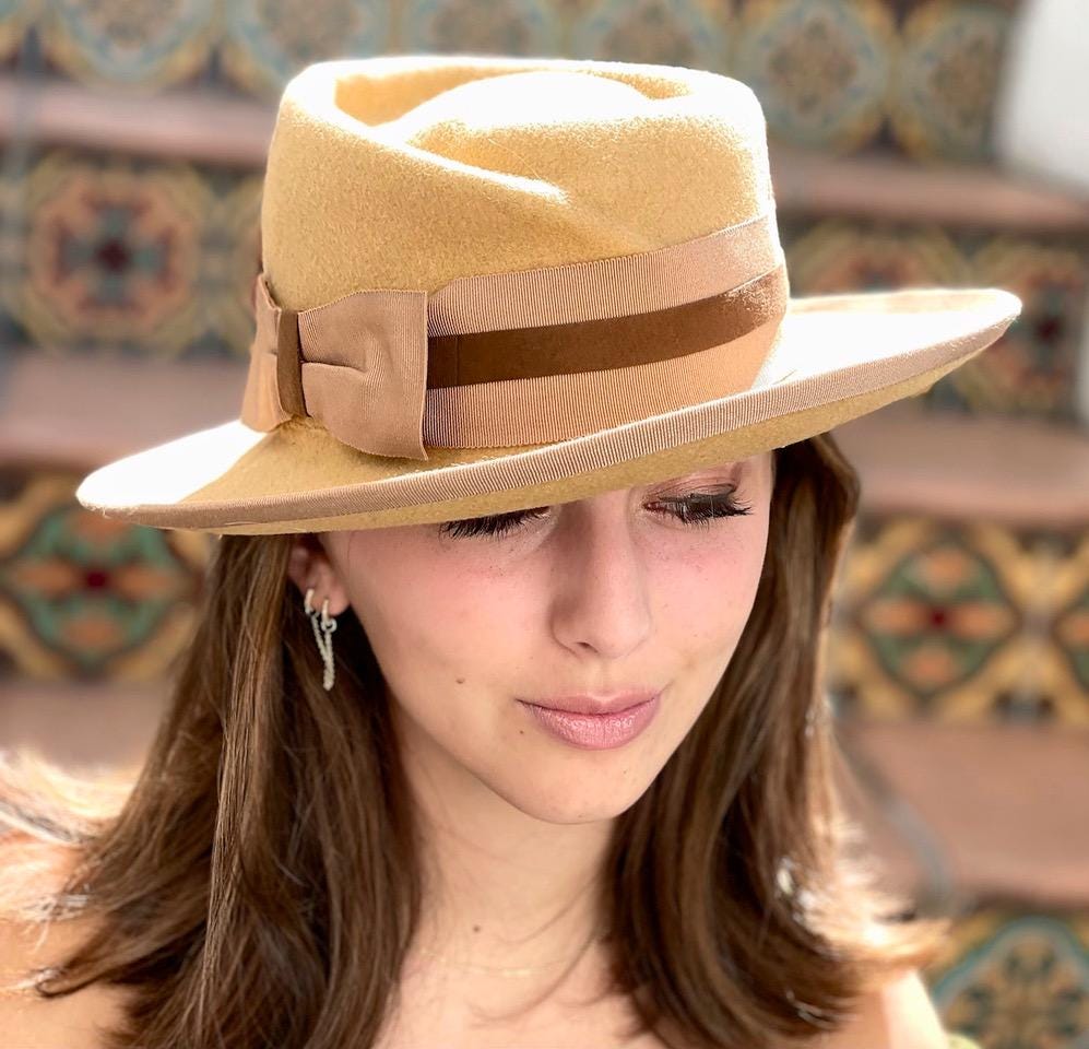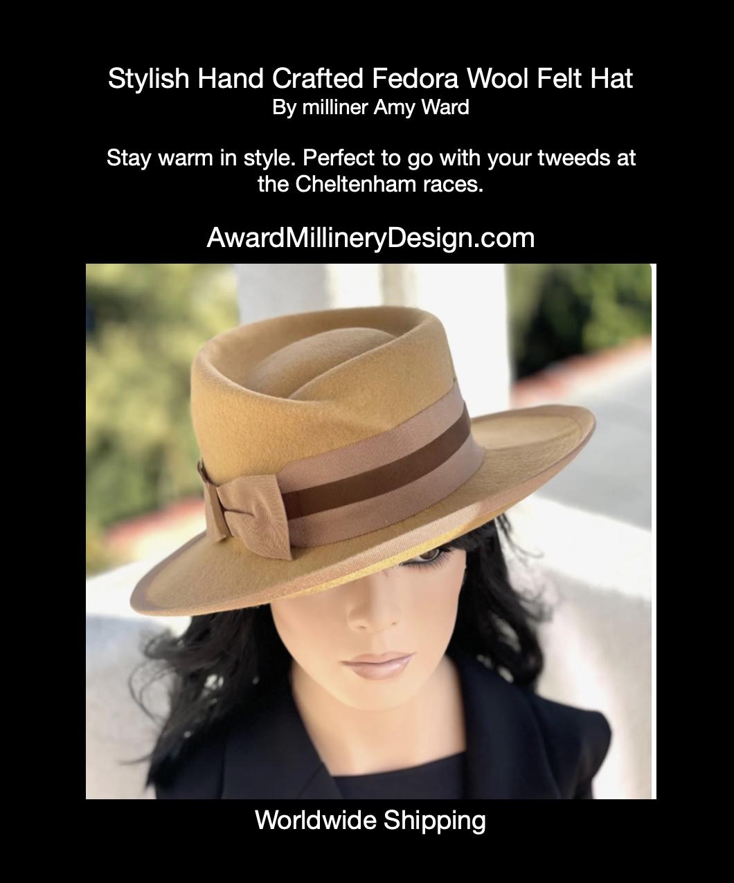 I made this French mustard yellow wide brim hat by hand in my millinery studio in the Hollywood Hills, using the highest quality 100% pure marino wool felt. It took me 3 days to steam, block. shape, size and trim. For the trim I used classic grosgrain ribbon and a dark brown faux swede. This charming hat is comfortable and keeps you warm in winter. My handmade felt hats are so soft and comfortable, not like the mass produced machine made poor quality ones made in China. Like Diane Keaton you can wear your felt hat everywhere and look divine. Looks great with Holland Cooper tweeds for Cheltenham Races.
