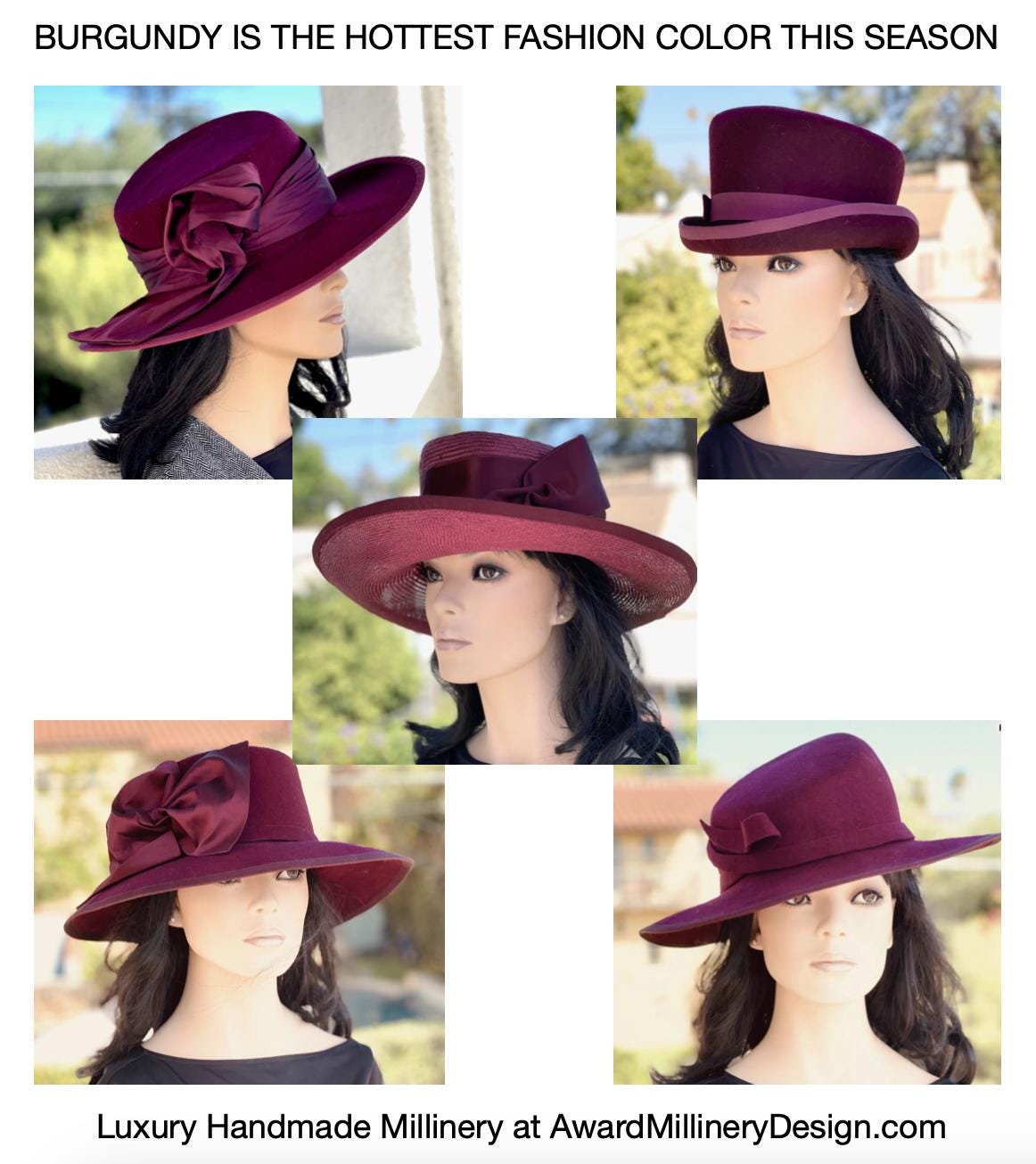 So I just had to feature burgundy in my latest millinery collection of handmade. luxury hats. You can make an appointment to visit me in my studio in Los Angeles or purchase on my website at AwardMillinery Design.com